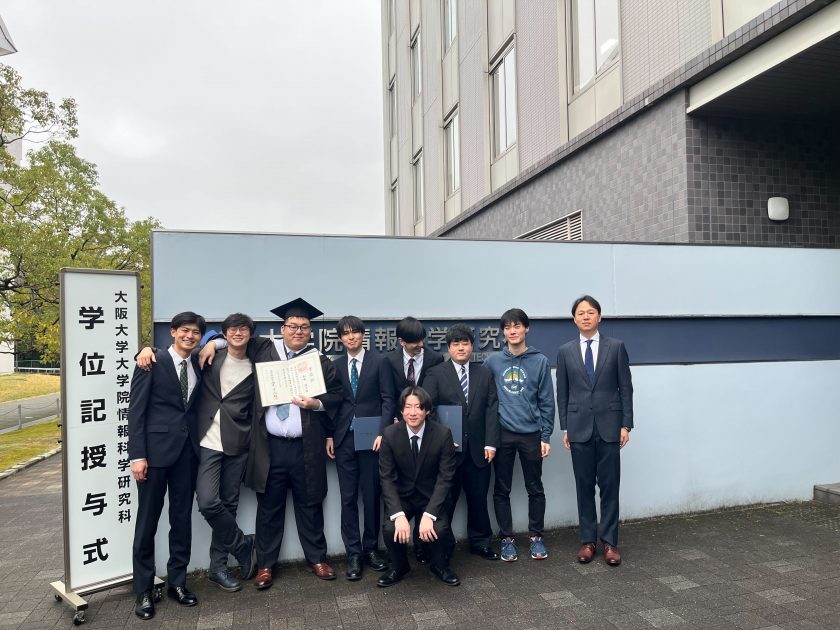 2024年3月25日、7名の大学院生 (博士後期1名、博士前期6名) と7名の学部生が修了・卒業しました。D3の加藤謙志朗さんに博士 (学位) が授与されました。修了・卒業にあたり、M2の澤風馬さんが当研究科より「研究科賞」を授与されました。この研究科賞は、本研究科を優秀な成績で修了した博士前期課程の学生に在学中における努力と業績を称えて表彰されるもので、各専攻から1名だけが選出されます。昨年の岩渕さんに引き続き、当講座からは二年連続の授与となり、非常に光栄に思います。なお、澤さんは、2024年の4月より博士後期課程として進学し、引き続き尾上研の一員として活躍する予定です。それだけでなく、昨年に博士学位を取得し卒業した渡大地さんが嵩賞を授与されました。この賞は、故嵩忠雄先⽣の業績を記念し、本学の博士の学位を取得した優秀な若手研究者を表彰するものです。学部生は、7名中5名が引き続き大学院へ進学する予定です。学生がどんどん成長して、巣立って行くところを間近で見届けられたことをとても嬉しく思います。彼らの新たな門出を心より祝福したいと思います。ご卒業おめでとうございます。